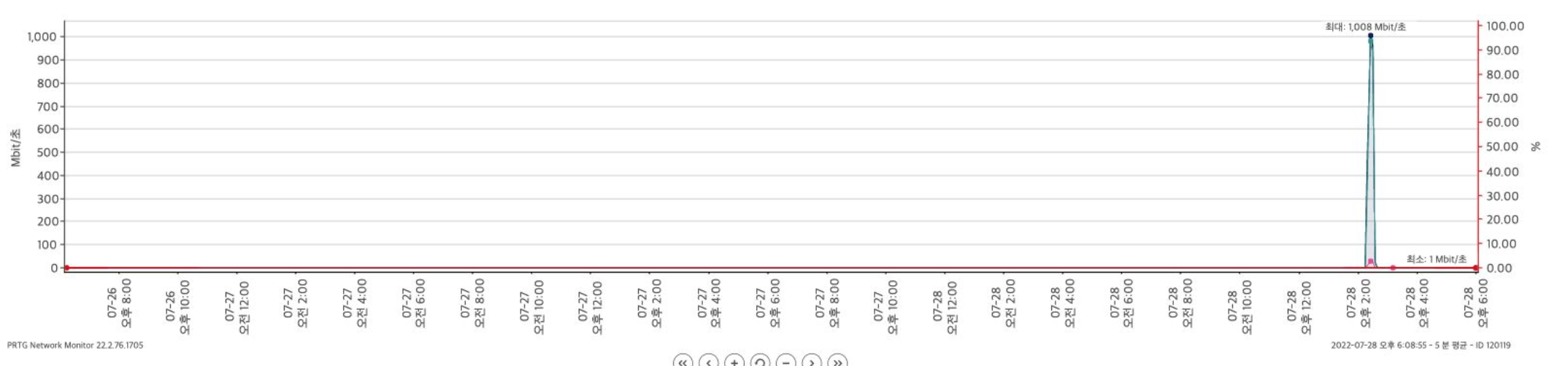 이전 시간동안의 Network 트래픽 수치 확인을 해보니 최대 1000Mbit/초 에서 눌리는 형태의 그래프를 확인했다!