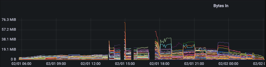 02/01 17:35 경 적용 이후 key의 분산 범위는 다소 높아졌으나 random key 적용 전 기존 최대 bytes in 수치의 약 1/5이어서 처리 시 크게 문제되지 않는 수치였기에 더이상 consumer lag 및 taskmanager restart가 없는 평화를 되찾을 수 있었다.